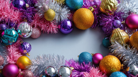 A vibrant arrangement of colorful Christmas ornaments and shiny decorations on a soft background. Perfect for holiday-themed designs and celebrations.