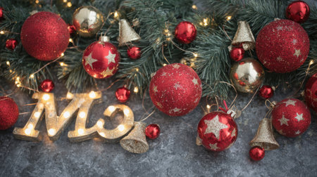 Christmas decoration, Christmas and New Year holidays background, winter season with Christmas ornaments and blurred lights