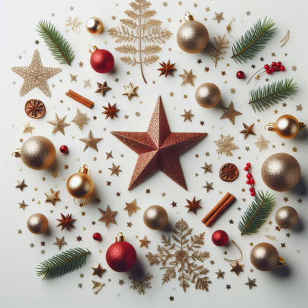 A star is surrounded by many gold and red ornaments. The star is the center of the image and the ornaments are scattered around it. The image has a festive and celebratory mood