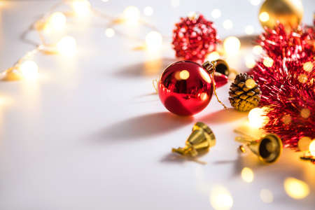 Christmas decoration balls and ornaments over abstract bokeh background on white background. Holiday background greeting card for Christmas and New Year. Merry Christmas