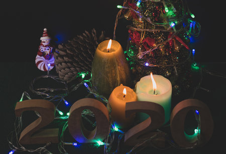 End of the year 2020 ready with candles, Christmas trees, and party lights for a luxurious party, new year's Eve atmosphere to welcome the new year 2021.