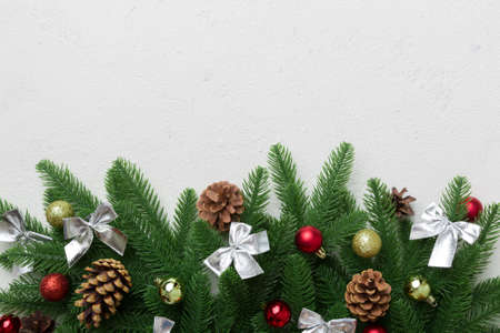 Christmas background with fir branches and Christmas decor. Top view, copy space for text.
