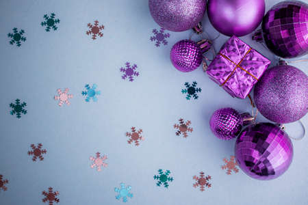 Christmas holidays composition, top view pink-purple-violet Christmas decorations on white-blue background with copy space for text. Flat lay. Winter, postcard template.