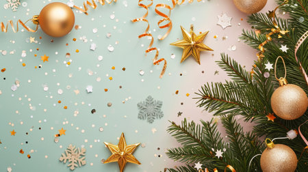 Celebrate the holiday season with this stunning Christmas border featuring stylish decorations, sparkling confetti, lush green fir branches, and festive elements – ideal for seasonal greetings