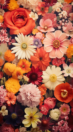 A vibrant texture of various blooming flowers presenting a beautiful and colorful floral assortment