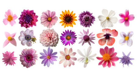 A mesmerizing set of diverse and vibrant flowers, each delicately isolated on a pure white background, radiating natural beauty and floral elegance. Perfect for botanical enthusiasts and floral design.