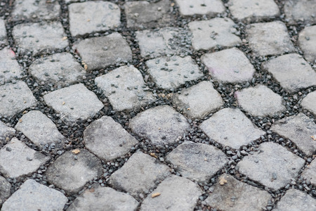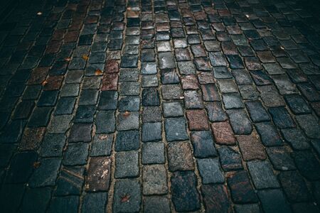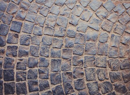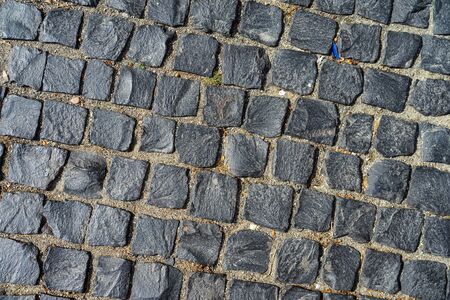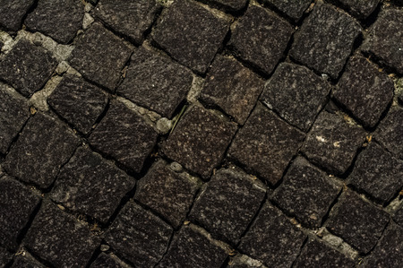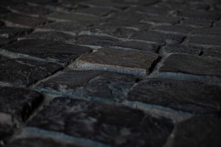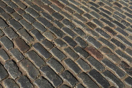 Old old dark paving cobblestone outdoors as background diagonal view close up