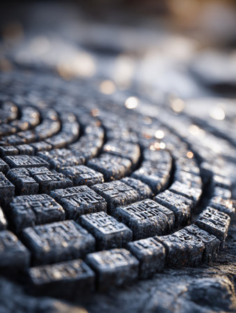 Intricate stone patterns arranged in circles reflect sunlight, representing ancient city planning and architectural design from history.