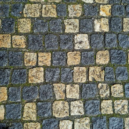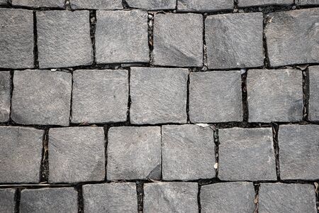 Stone pavement texture. Granite cobblestoned pavement background. Cobbled stone road regular shapes, abstract background of old cobblestone pavement close-up. Parallelepiped.