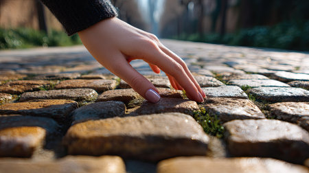 A gentle hand reaches down to touch a weathered cobblestone pathway, illuminated by soft sunlight filtering through nearby trees, capturing a moment of serenity outdoors.