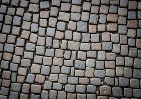 Rustic cobblestone street background with uneven, weathered stones in various shades of gray and brown.