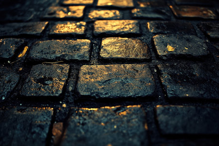 Wet cobblestone pathway close-up. Vibrant golden reflections on wet surface. Green grass peeking through stones. Nighttime street scene. Illuminated pavement. Textured ground. Dark background enhancing light. Rain-soaked path. Atmospheric urban setting. Glistening water. Intricate paving pattern. Evocative street photography. Serene evening.