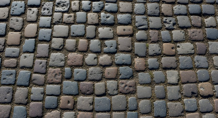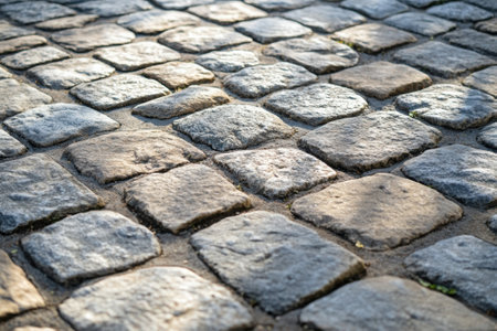 Cobblestone street. This image showcases a detailed view of a cobblestone street. The focus is sharp on the foreground, with a blurred background.