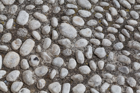 The view of pattern of the road paved with rounded big cobblestones. Stone background. Japan