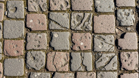 Detailed view of weathered cobblestone stones arranged in a square pattern on the pavement