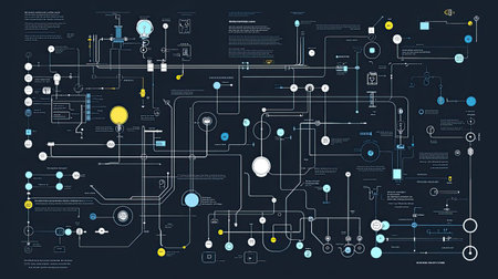 Intricate diagram featuring flowcharts and graphic elements designed for data visualization. This abstract layout includes various symbols and connections to illustrate complex information effectively.