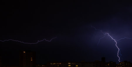 Lightning storm over the city at the summer heavy rain. Dramatic, breathtaking atmospheric natural phenomenon. Left bank outskirts of Kyiv, Ukraine.