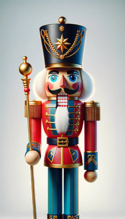A vibrant nutcracker figure stands against a turquoise background, embodying holiday spirit with its colorful details and traditional design perfect for festive celebrations.