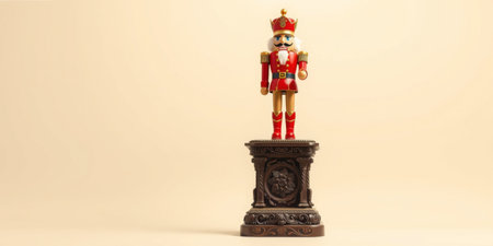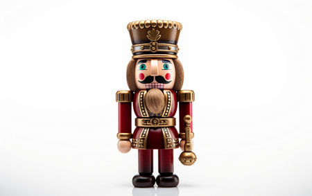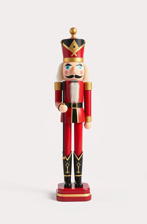 A wooden nutcracker soldier wearing a regal crown and a red cape is prominently displayed, holding a gold staff