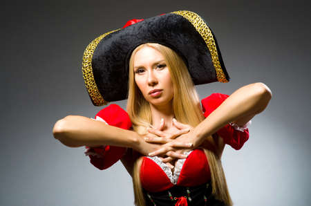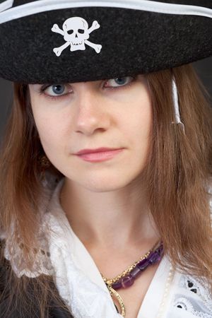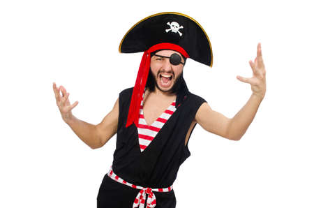 Cute little 5 years old blonde girl playing in pirate hat and eyepatch isolated on white background