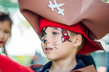 Boy Cat Pirate costume. Halloween party in kindergarten. Aqua makeup painted kids face. Bright