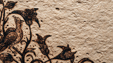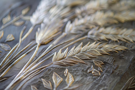 Closeup of a sophisticated embossed floral pattern on a metallic surface, with selective focus