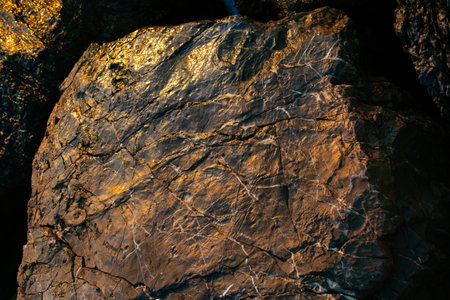 A detailed macro shot reveals the rough, textured surface of a dark stone embedded with glittering veins of gold mineral. The gold streaks catch the sunlight, reflecting a metallic sheen against the coarse, grey rock. Shadows play across the surface, highlighting the intricate patterns and the contrast between the dull stone and the luminous gold. This close-up view emphasizes the natural beauty and geological formation of the mineral-rich rock.
