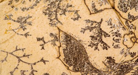 A fascinating rock surface showcases unique shapes and patterns resembling ancient fossils. The warm tones highlight the intricate designs, creating a captivating natural artwork.