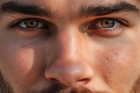 Lovely close-up of a man's hazel eyes with soft hazel eyebrows and a hint of peach on his lips