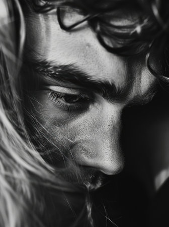 A captivating portrait of a man with a neat beard, gazing into the distance with a mix of contemplation and mystery under dramatic lighting, evoking depth and emotion in a serene setting.