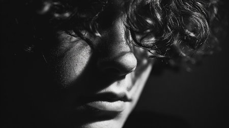 Close-up portrait of a man with glowing skin and intense gaze in dramatic lighting. High quality photo