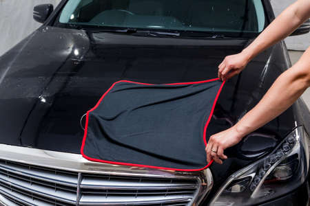 A man cleaning car with microfiber cloth, car detailing concept. Selective focus.Man polishing cleaning car with microfiber cloth