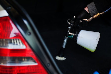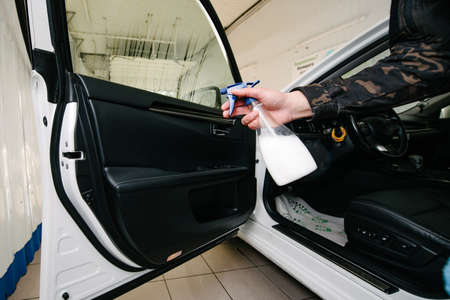 Handsome young guy, man doing professional dry cleaning salon in the car. Concept: Auto Car Service, Car Wash, Dry Cleaning Machines.