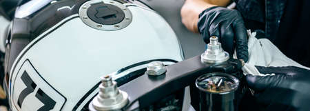 Unrecognizable mechanic cleaning a customized motorcycle in his workshop