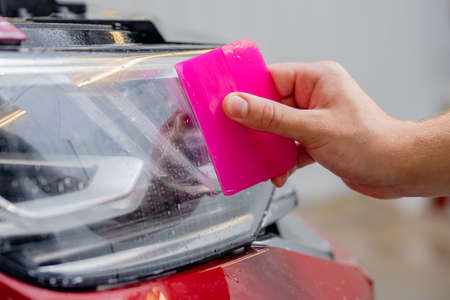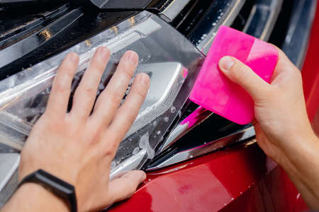 Mechanic with transparent film, car paint protection. Mechanic installs car paint protection film. Install car paint protection film. Car wrap concept.