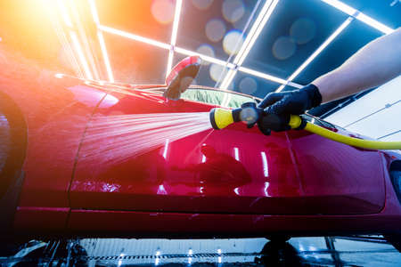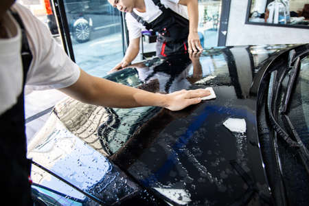 Car wash worker wipes the car after washing with microfiber towel. Professional car wash