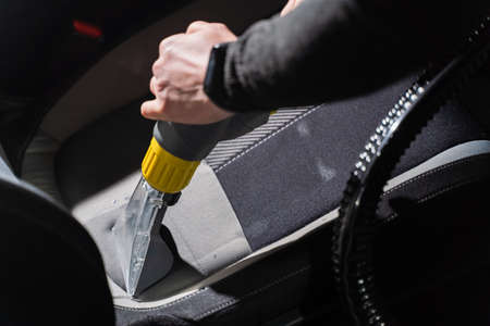 Details of car cleaning - male using professional steam vacuum for dirty car interior