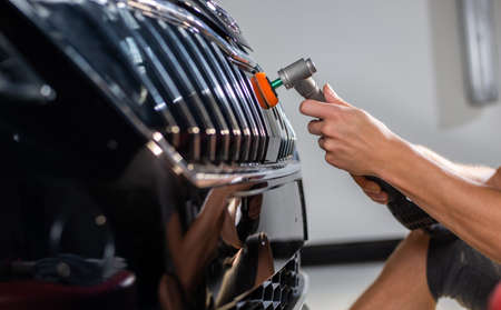 Car polish wax worker hands applying protective tape before polishing. Buffing and polishing car. Car detailing. Man holds a polisher in the hand and polishes the chrome car part