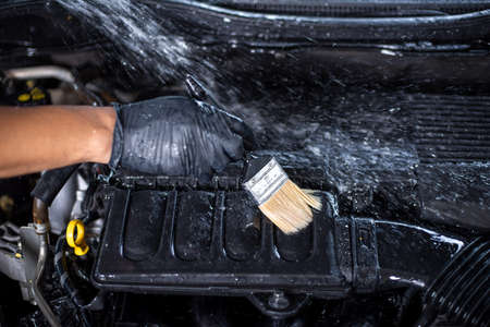 Cleaning the engine bay. Car cleaning and car detailing concept.