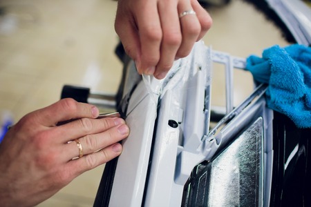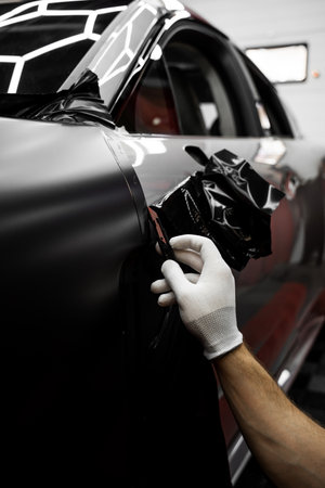 Transparent film, car paint protection, wrapping specialis. Car detailing. Selective focus.