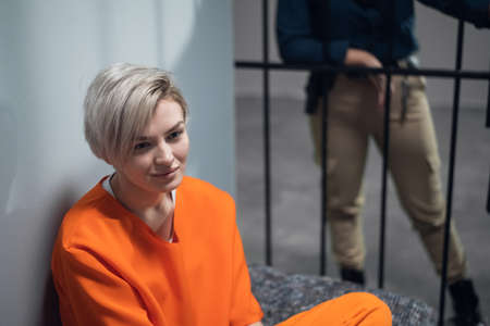 Portrait of a prisoner in an orange uniform against the background of prison bars.