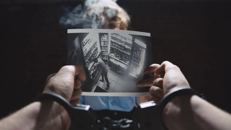 Lady interrogator with cigarette demonstrating photo evidence to suspect