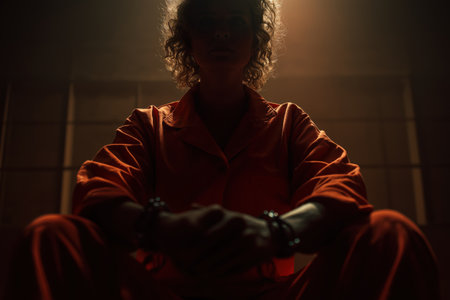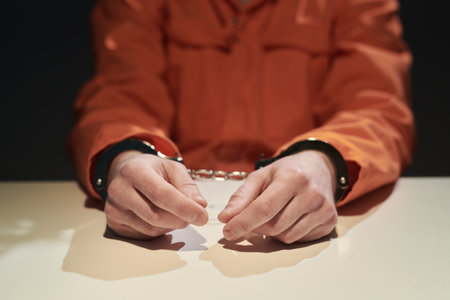 Persons hands handcuffed on table in dimly lit room, wearing orange jumpsuit suggesting incarceration. Shadows add intense, moody atmosphere reflecting seriousness of situation