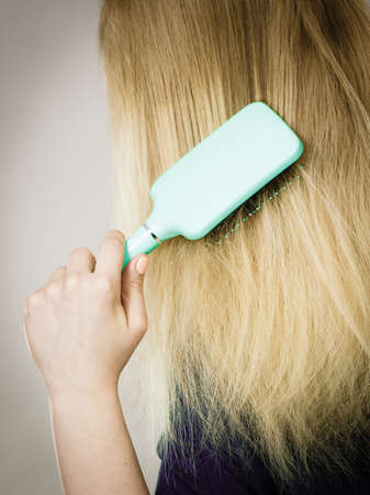 Everyday hygiene and care about good look. Back view of blonde casual girl combing her long straight hair. Woman using blue comb hairbrush.