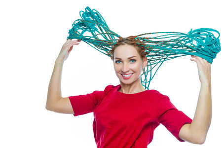 Youth Lifestyles. Funny and Laughing Caucasian Female with Green African American Dreadlocks with Fly-Away hairs Against White. In Casual Clothing. Horizontal Shot