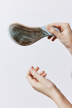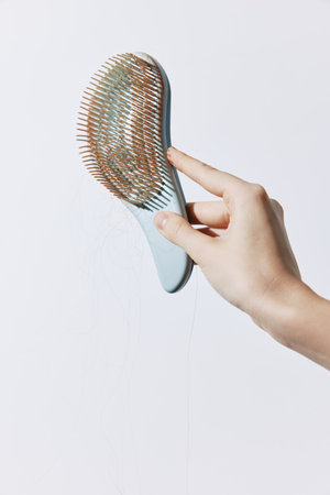 Hand holding comb with hair strand coming out