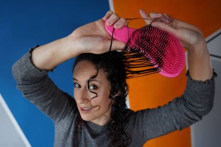 Frustrated Indian teen girl trying to brush her tangled long locks on blue studio background. Hairdressing and beauty concept