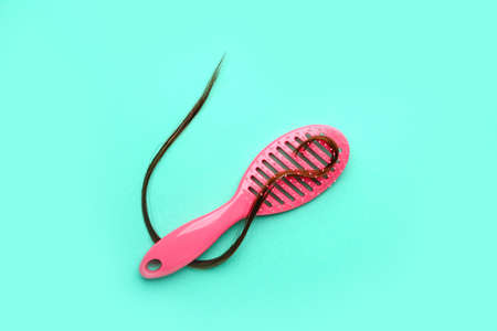 Hair strand and brush on color background