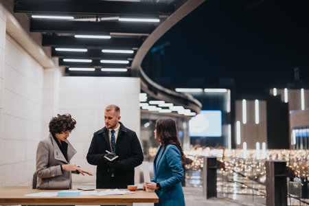 A trio of people engage in a focused business discussion over documents, with the vibrant city lights providing an atmospheric backdrop.