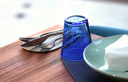 Empty plates and chopsticks on a wooden table in a restaurant.